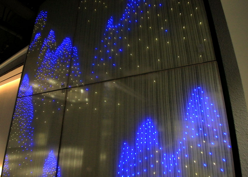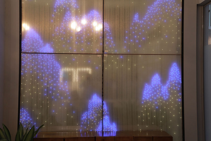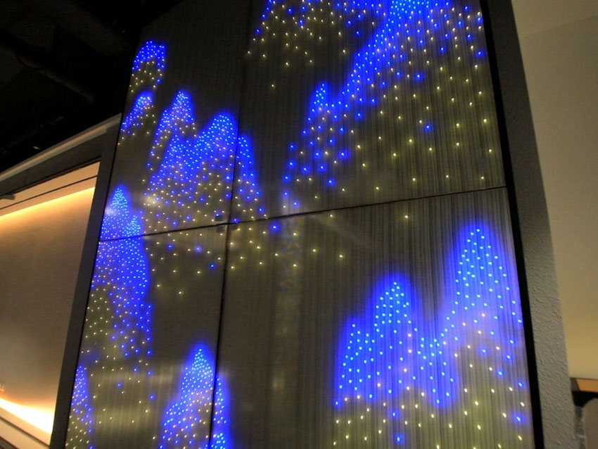 構筑空間的美感,營造獨特的空間魅力,高密度的點點LED光源,通過不同燈光顏色的組合,在玻璃上鑲嵌出了一幅山峰高低起伏的圖畫。原本平面的玻璃背景墻,呈現出立體的觀感。