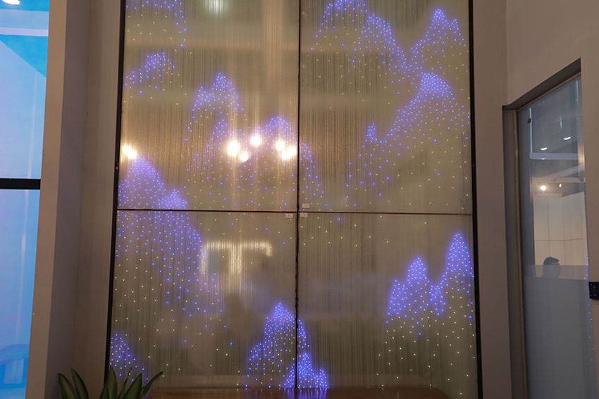 該玻璃以藝術玻璃為基礎,與LED燈珠、導電膜、EVA等經特殊工藝夾合制成。4片玻璃里面點綴了上千顆LED燈珠。LED燈珠不發光時,它就是一款普通的夾絲玻璃。