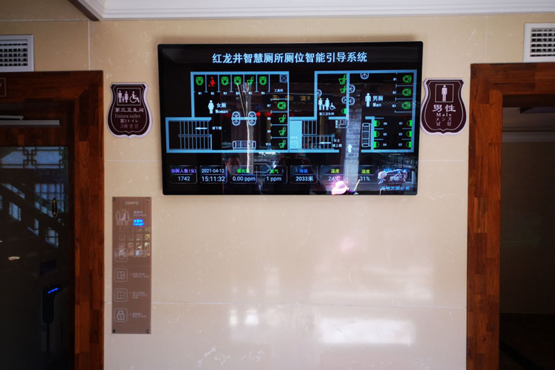 進(jìn)入公廁之后,就能看到正前方的墻上掛著一個(gè)電子屏幕,可以查看廁所內(nèi)的空間平面圖和各個(gè)廁所分布位置,還可以通過(guò)紅綠色的標(biāo)志查看廁位是否正在被使用,有效避免廁所擁擠和排隊(duì)的情況。