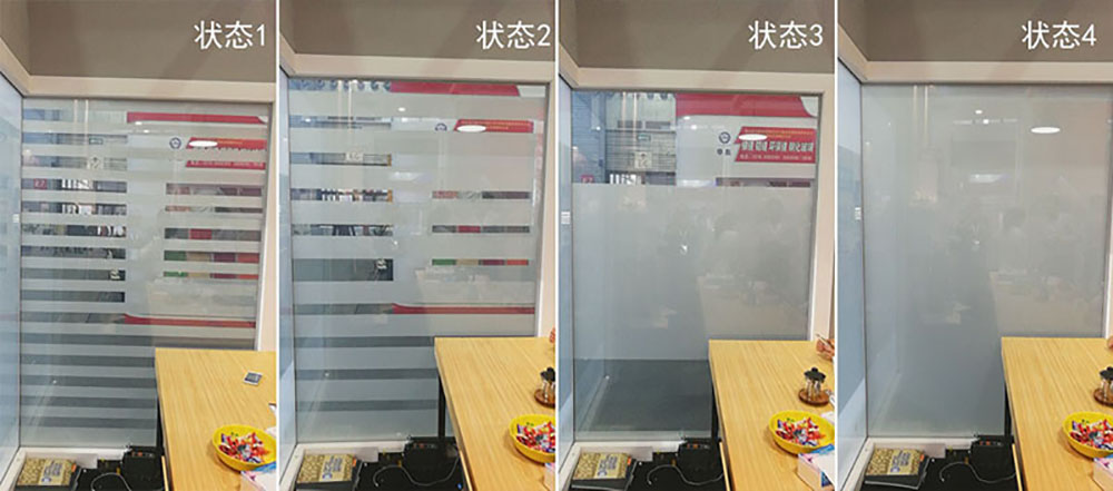 隱形電子百葉玻璃是分區(qū)調(diào)光玻璃的一種常見應用。乍看之下,它與普通玻璃無異,但通電后可控制顯示百葉窗一般的動態(tài)變化效果,且通過遙控器就能轉(zhuǎn)換效果。