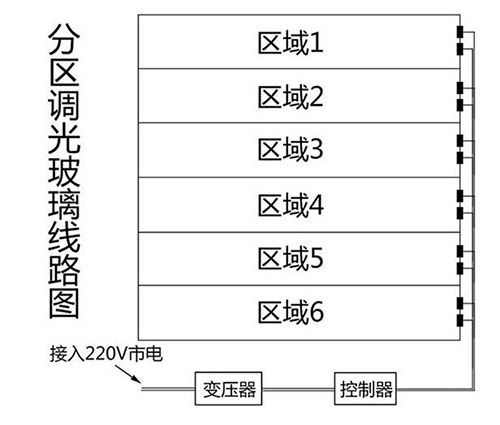 分區(qū),是通過技術(shù)手段,把調(diào)光玻璃中的液晶膜分成若干個獨立的、不交織的片區(qū),讓液晶膜“分而不斷”,從而實現(xiàn)對每個片區(qū)通斷電的單獨控制,讓玻璃顯示透明或霧化效果的圖案,這就是分區(qū)調(diào)光玻璃。